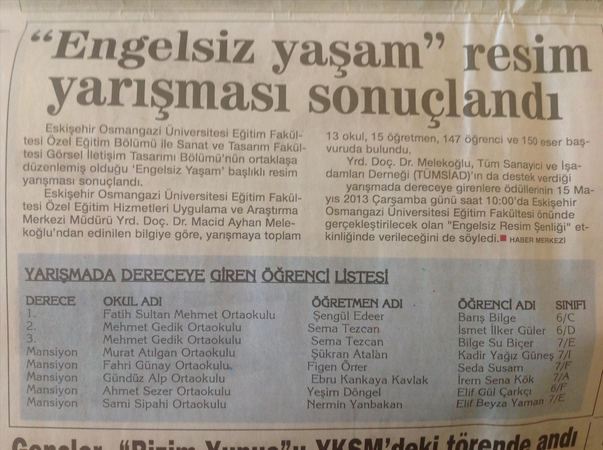 Bölümümüz yürütülmekte olan ‘Zihin Engellilere Resim-İş Öğretimi’ dersi kapsamında, öğrencilerimizin değerli katkıları ile ‘Engelsiz Düşler Resim Şenliği’ yapıldı. 15 Mayıs 2013