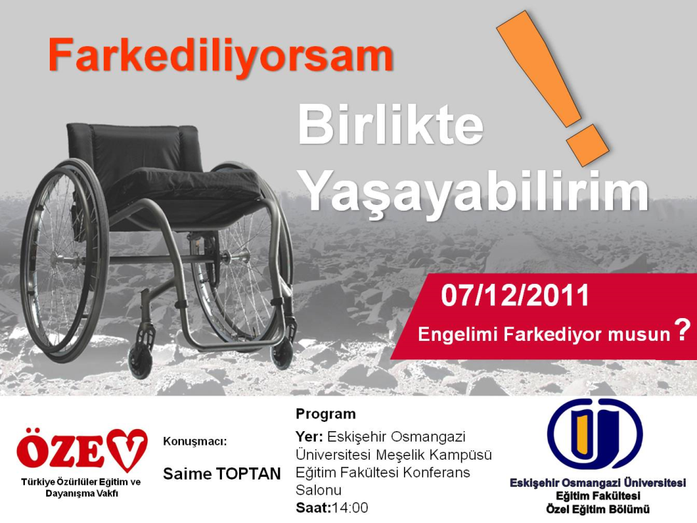 Eskişehir Osmangazi Üniversitesi Eğitim Fakültesi Özel Eğitim Bölümü ve Türkiye Özürlüler Eğitim ve Dayanışma Vakfı (ÖZEV) işbirliğiyle düzenlenen Sayın Saime Toptan’ın konuşmacı olarak katıldığı “Engelimi Fark Ediyor musun?” konulu konferans. 7 Aralık 2011, Çarşamba, Saat: 14:00, Eğitim Fakültesi Konferans Salonu.