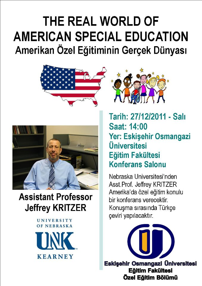 Nebraska Universitesi’nden Yrd. Doç. Dr. Jeffrey KRITZER, ESOGÜ Eğitim Fakültesi Konferans Salonunda 27 Aralık 2011-Salı, Saat 14:00’da, Amerika’da özel eğitim konulu bir konferans vermiştir.