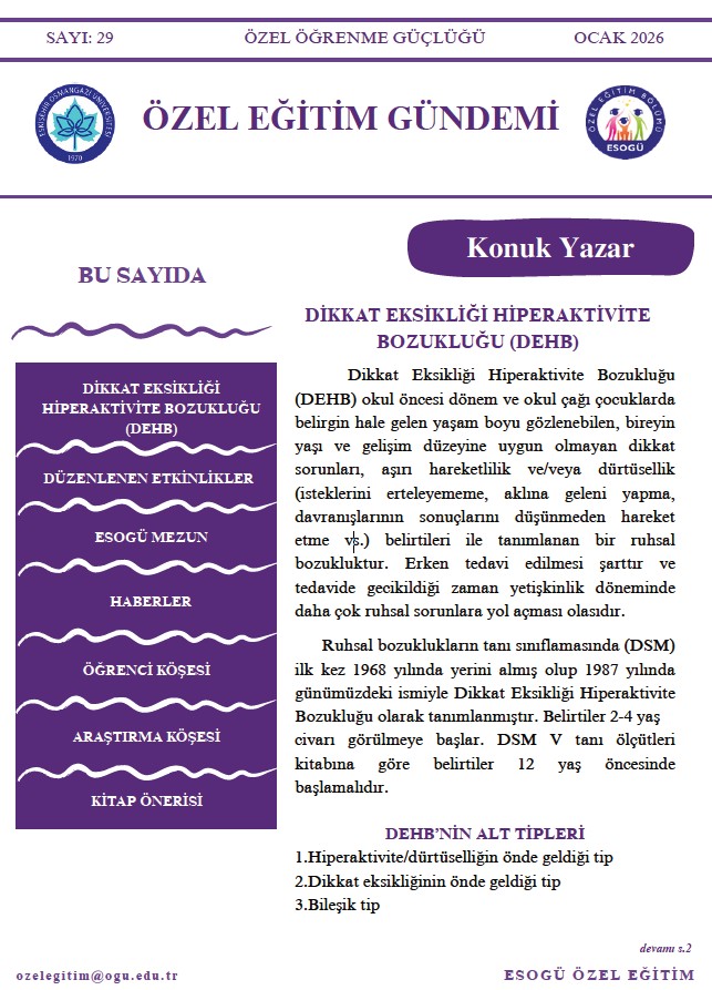 Özel Eğitim Gündemi özel eğitim alanındaki güncel bilgileri okuyucuya aktarmak amacıyla oluşturulan bir yayındır. ESOGÜ Özel Eğitim bölümü öğretim elemanları tarafından oluşturulan ve yayına hazırlanan Özel Eğitim Gündemi ayda bir sayı olacak şekilde yayınlanmaktadır. Her sayıda otizm spektrum bozukluğu, zihin yetersizliği ve öğrenme güçlüğü konularından biri seçilerek ilgili alandaki en son gelişmeler, ilgili aydaki etkinlik bilgileri, bilimsel makale ve kitap tanıtımına yönelik içerikler sunulmaktadır. Bununla birlikte her sayıda ESOGÜ öğretim elemanlarının dışında bir özel eğitim uzmanı davetli yazar olarak Özel Eğitim Gündemi’ne katkı sağlayacaktır. ESOGÜ Özel Eğitim Gündemi’ni okumak için aşağıdaki linklere tıklayınız. Sizlere iyi ok
